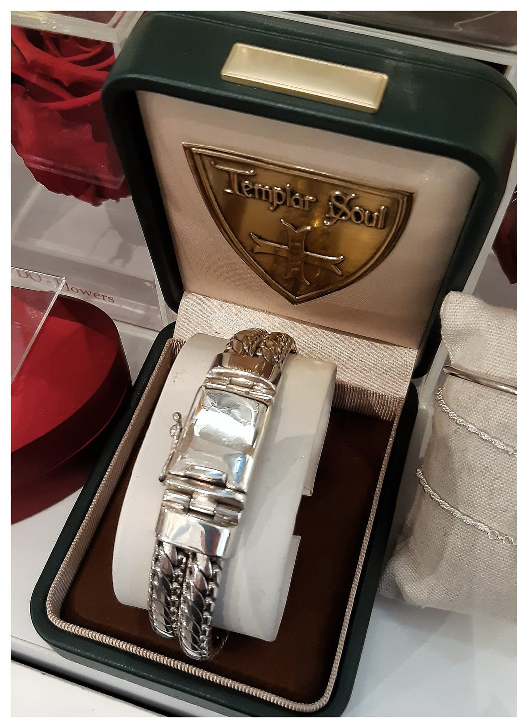 Bracelet livré dans boîte-coffret cuir luxe surmontée d'un écusson en étain Templar soul + sac cadeau prêt à offrir (emballages coûteux inclus dans le prix).