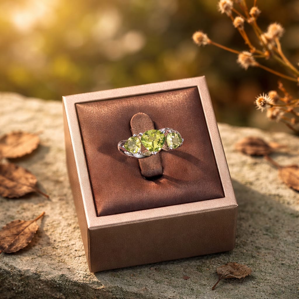 Réalisation d'un petit atelier, cette bague fine à l'argent brillant rhodié surmontée d'une très belle sélection de péridots purs est un bijou d'exception.