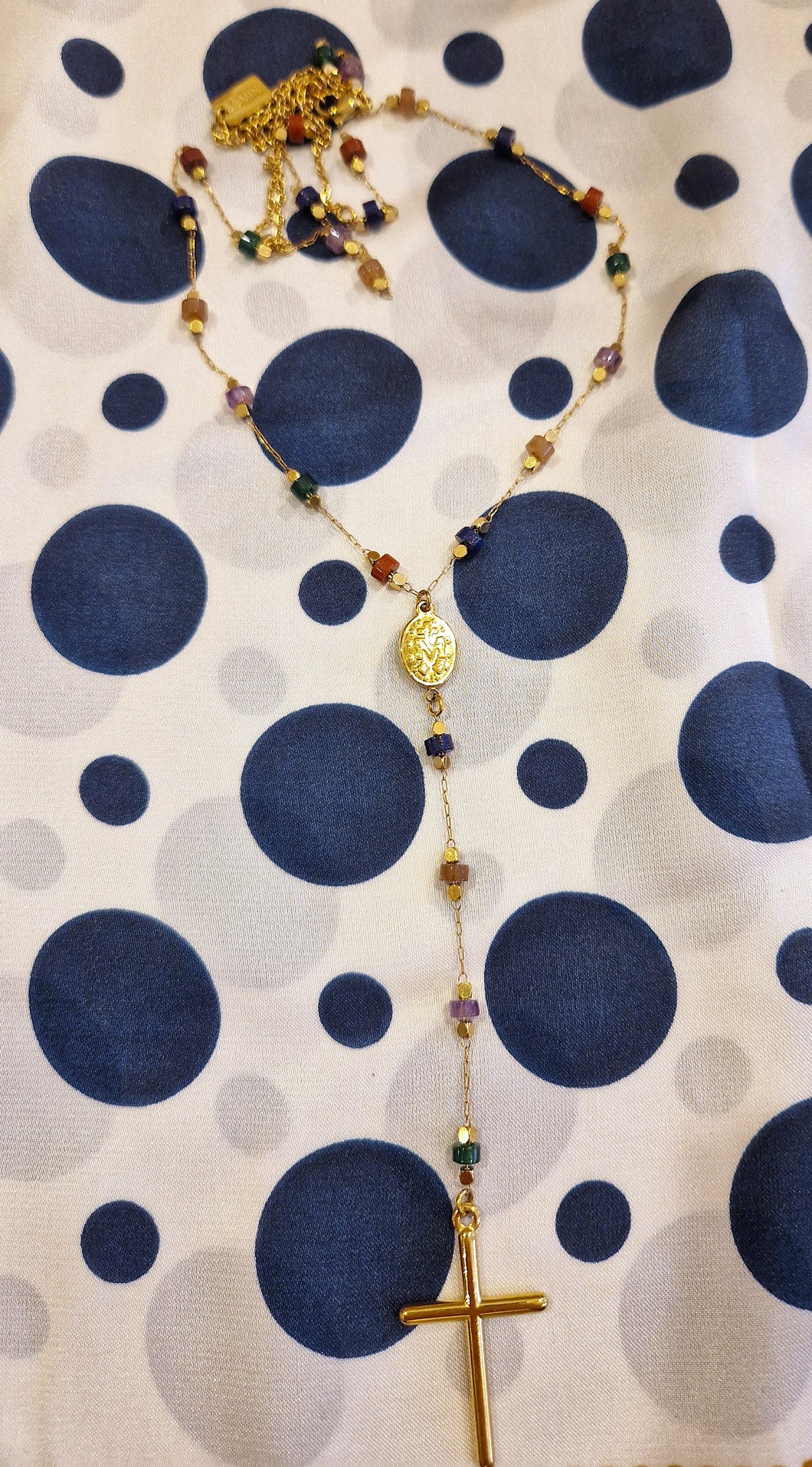 Très beau chapelet en inox doré et perles de couleurs en résine de bijouterie d'une qualité rare sur le marché. Aucune allergie possible. Longueur réglable.