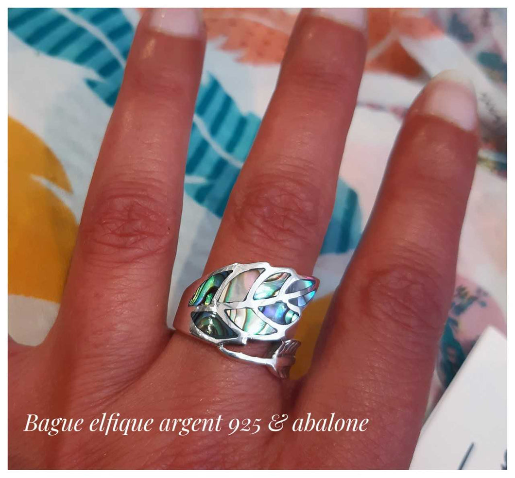 Magnifique bague "Feuille" elfique en argent 925 ornée de nacre d'abalone bleu-vert d'une lumière incomparable.
